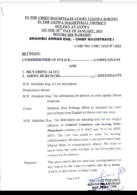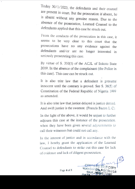 In a five-page court judgement, delivered on January 30, 2023 in the Chief Magistrate Court I Gutwa, Sokoto, obtained exclusively by this publication, Chief Magistrate Shuaibu Ahmad, Esq set the suspects free due to the absence of the police prosecution during series of hearings.