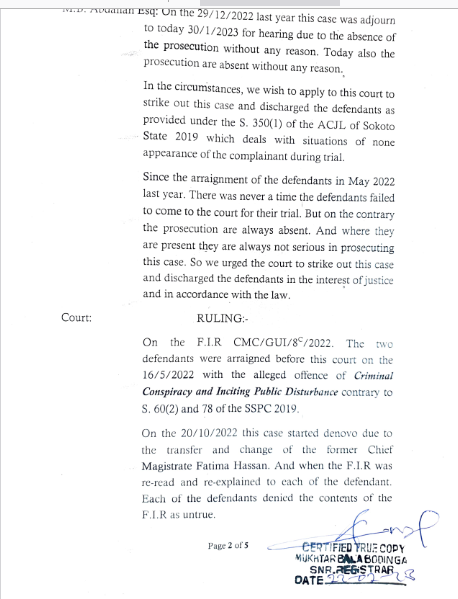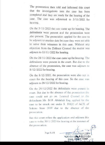“On the 8/12/2022, the prosecution were also not in court for the hearing of this case. So the case was adjourned to 29/12/2022 for hearing. On the 29/12/2022 the defendants were present in court. But due to the absence of the prosecution the case could not go on. Learned Counsel to the defendants Mr. M.B Abdallah, Esq applied for the case to be struck out under S.350(1) of ACJL of Sokoto State 2019 due to the absence of the prosecution. But the court refused the application and adjourned this case to today 30/1/2023 for hearing at the instance of the prosecution. Today, 30/1/2023, the defendants and their counsel are present in court. But the prosecution is absent, he is absent without any genuine reason. Due to the absence of the prosecution, Learned Counsel to the defendants applied that this case be struck out.