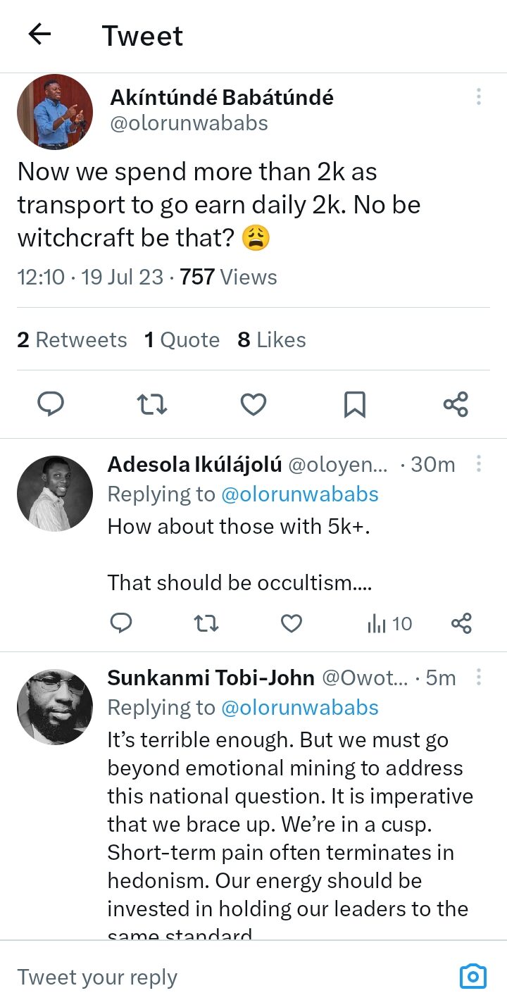 “Now we spend more than N2,000 as transport to go earn daily N2,000. No be witchcraft be that?” a Twitter use had said.