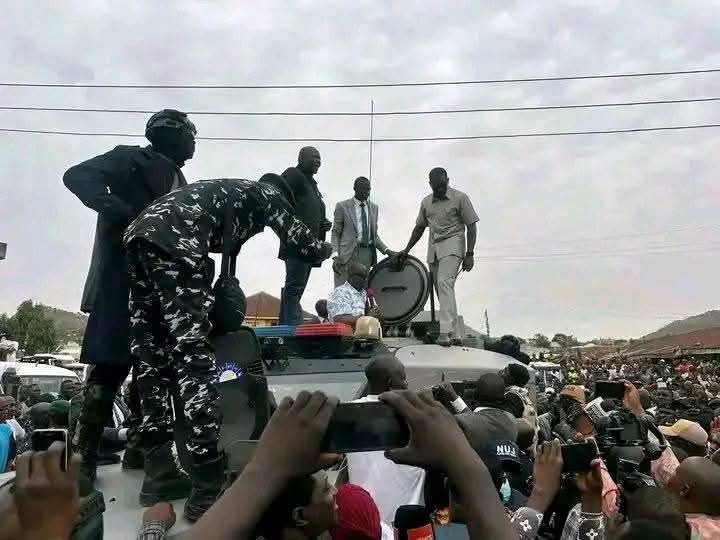 Plateau state governor Caleb Mutfwang arrives at the scene in a motorcade of vehicles